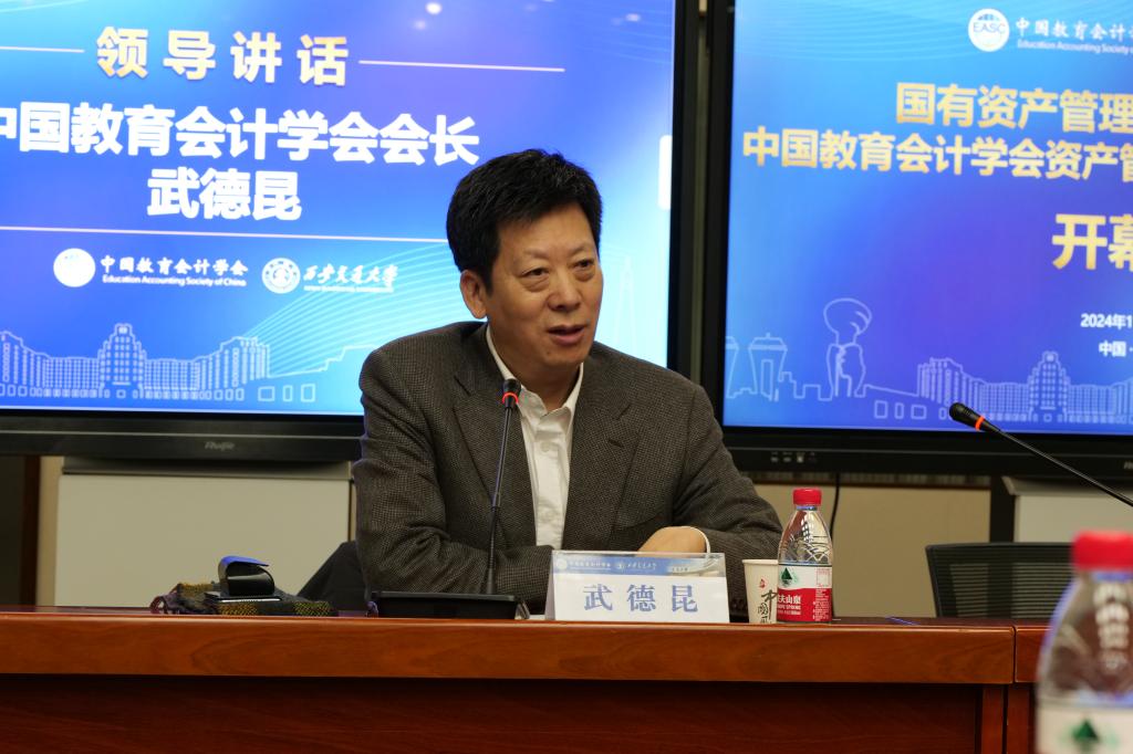 武德昆代表学会讲话,他从高校国有资产改革和资产治理现代化的角度,阐述了国有资产管理的最新政策要求,及其对推动我国教育事业持续健康发展的重要意义,并全面回顾了资产管理专委会的发展历程,对未来工作提出了明确的要求。他指出,在当前高校资产管理面临诸多挑战的背景下,中国教育会计学会专委会需要在宏观政策指导下充分发挥专业桥梁和纽带的作用,聚焦教育行业国有资产重大问题,积极推动各地区间的座谈交流,深入研究并推广案例成果,全面提升高校资产管理的整体素质。最后,他呼吁委员会成员共同努力,持续开展学习研讨,力争成长为资产领域的引领者,为全国教育事业的发展贡献重要力量。
