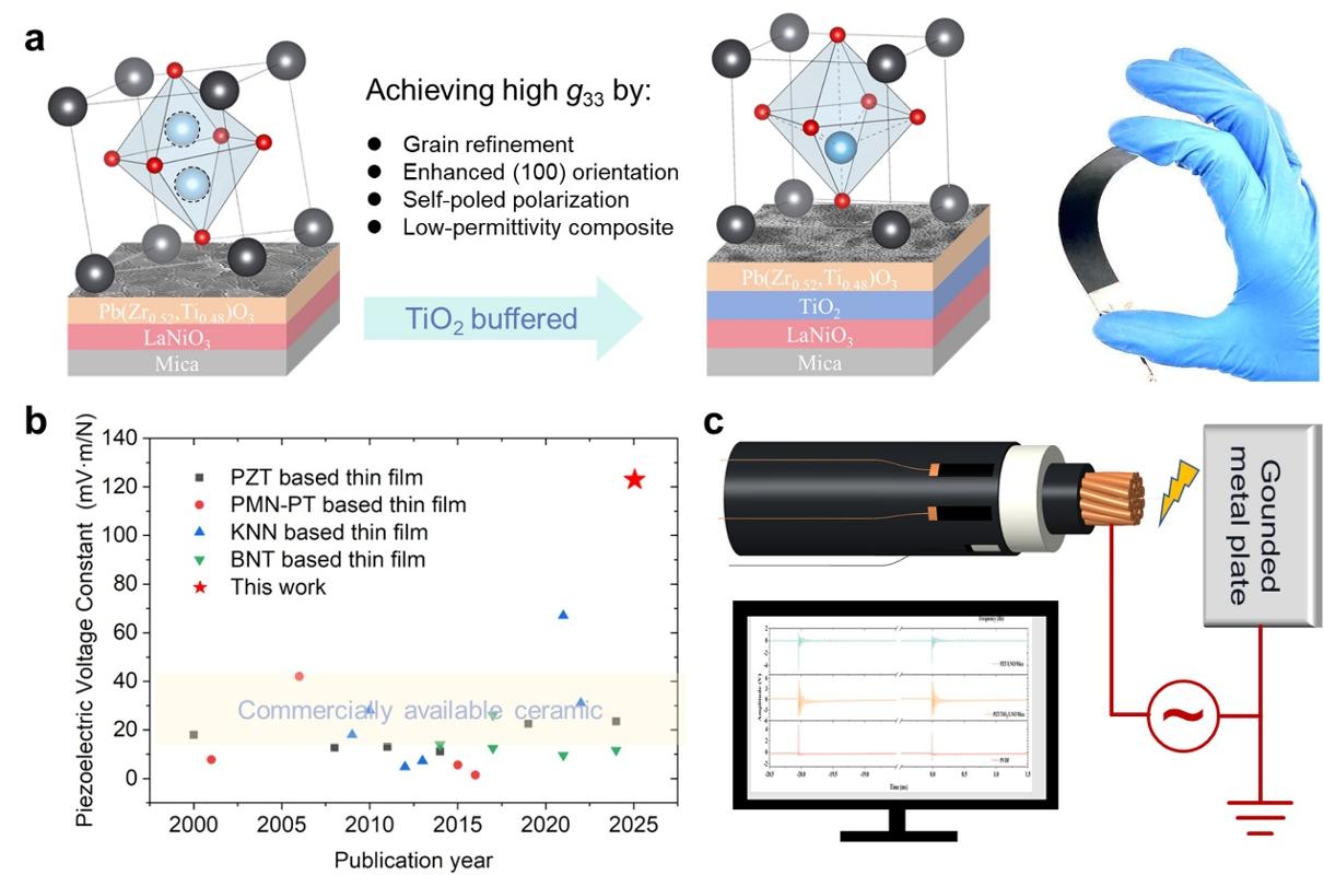 针对这一瓶颈,西安交通大学电气学院钟力生、高景晖教授团队提出了一种柔性压电薄膜的缓冲层调控性能提升策略,通过在Pb(Zr0.52Ti0.48)O3(PZT)薄膜下方引入TiO2缓冲层:一方面,利用缓冲层的低介电常数降低复合薄膜的等效介电常数;另一方面,通过缓冲层促进PZT晶粒细化、提升择优取向和诱导自极化效应,大幅提升了PZT薄膜的压电系数,实现了柔性压电材料传感性能显著提升。通过该方案获得了压电电压系数高达124 mV·m·N⁻¹的柔性压电薄膜,研制的柔性超声传感器件为电缆局部放电声学检测提供了新型传感解决方案。