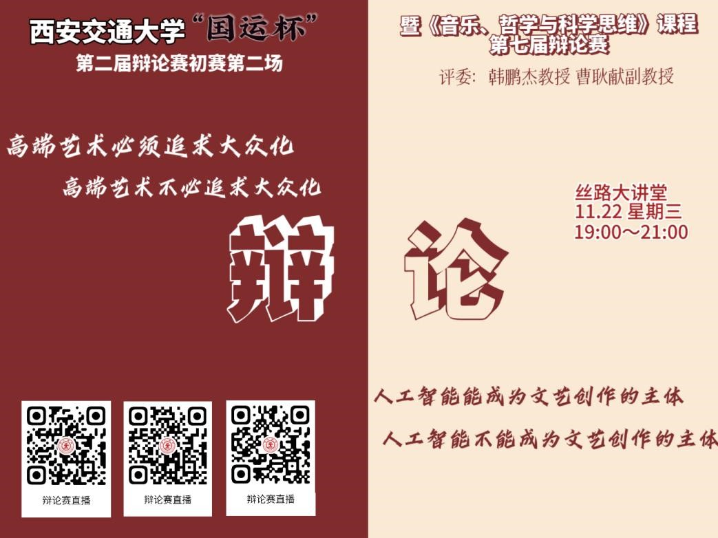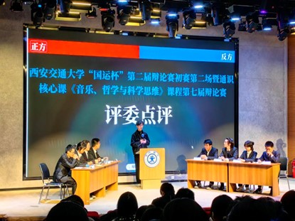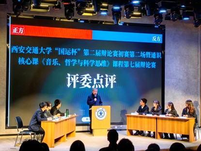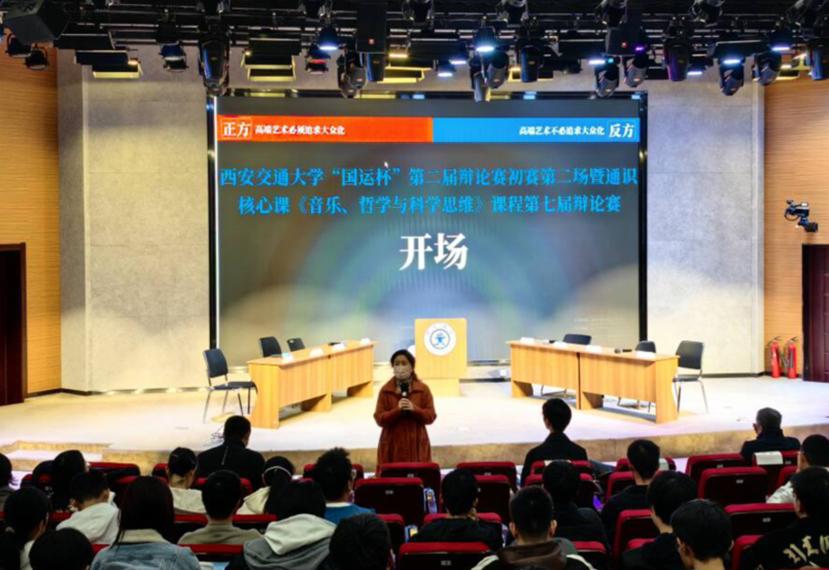 11月22日晚,西安交通大学“国运杯”第二届辩论赛初赛第二场暨西安交通大学基础通识类核心课程“音乐、哲学与科学思维”第七届辩论赛在丝路大讲堂举行。该比赛是西安交通大学首届“国运杯”系列辩论赛之一,旨在提升西安交大学子的思维能力和应变水平。此次辩论赛既是通识课程教学改革的展示,也是将中华优秀传统文化与课程思政相结合的一次探索与实践。到场嘉宾有西安交通大学国学教授、国际辩论赛知名评委韩鹏杰教授和“音乐、哲学与科学思维”课程负责人曹耿献副教授。