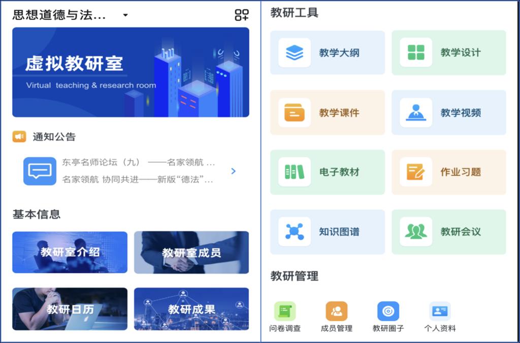 思想道德与法治课程虚拟教研室邀请来自清华大学、北京师范大学、西安交通大学等十几所高校的知名专家学者担任学术委员会特聘委员。在学术委员会指导下,充分发挥专家示范引领作用,为虚拟教研室建设提供支持与指导。创办“东亭名师论坛”品牌活动,先后举办了8场全国性的在线集体备课活动。此外举办了普通高校、职教、中学和小学4场共建大中小学思政课一体化专场论坛,举办推进党的二十大精神融入“德法课”论坛,邀请专家学者和一线教师进行深入的交流研讨。创建知识图谱,加强课程数字资源建设。教研室在确立“一个主题”“三条主线”的基础上,采用“自顶向下”与“自底向上”相结合的构建路径,推动知识点描述横向扩展和立体化呈现,团队共挖掘教材中的186个知识点,搭建了1棵知识树,将知识点的描述拓展到了7个维度。