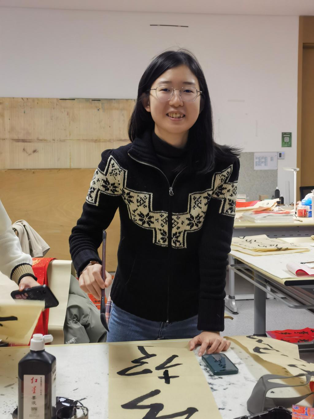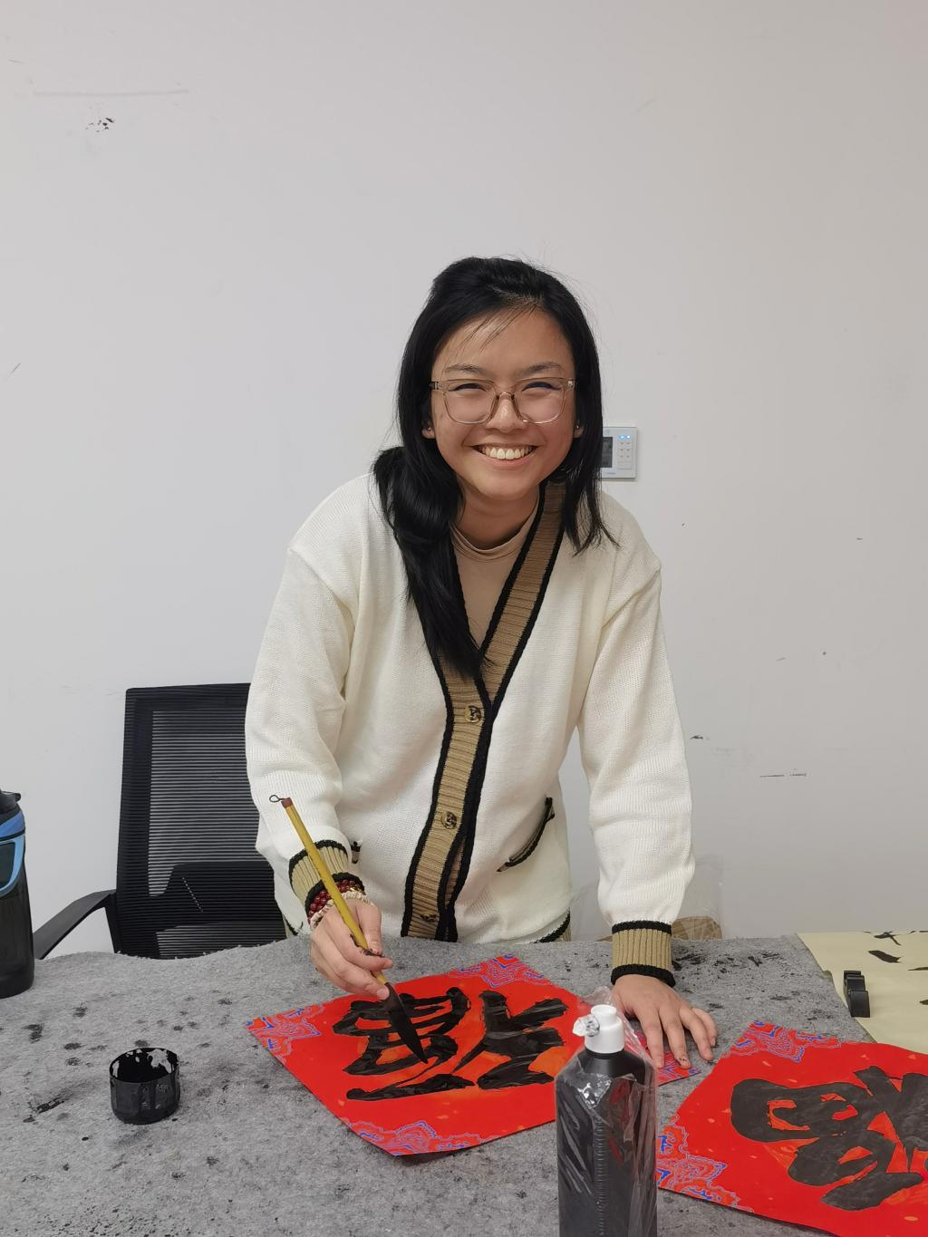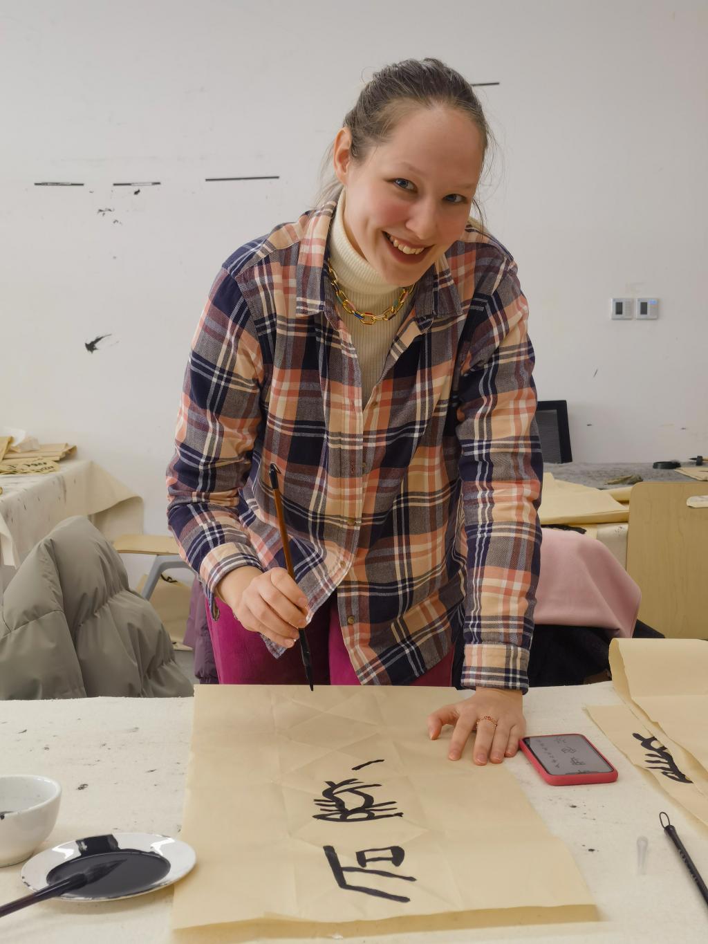 丽莉说:“事实证明,参加书法课程是一次收获颇丰、令⼈愉悦的旅程。入学前,我对汉字的掌握纯粹是理论性的。在上学期,我探索了汉字的历史演变,获得了宝贵的见解。然而,只有在书法课上,我才弥补了理论与实践之间的差距。在深⼊学习各种书体的精妙之处后,我发现自己对那些为汉字注入生命的笔画和细微差别赞叹不已。在对楷书逐渐熟悉的同时,对隶书和甲骨文的探索又为我的理解增加了丰富的层次。通过亲身实践,我掌握了掌握每种独特风格所需的艺术性和规律性。将抽象的概念转化为纸上有形的文字,这种体验确实令人欣喜。将汉字的历史知识与实际应用相结合,有助于更全面、整体地理解汉字。我衷心感谢王老师提供这次机会。他的指导和专业知识不仅传授了技术技能,还加深了我对蕴含在每一个笔触中的文化和艺术细微差别的理解。回想这段旅程,我对能有机会沉浸在中国书法的迷⼈世界中深感满足和感激。”