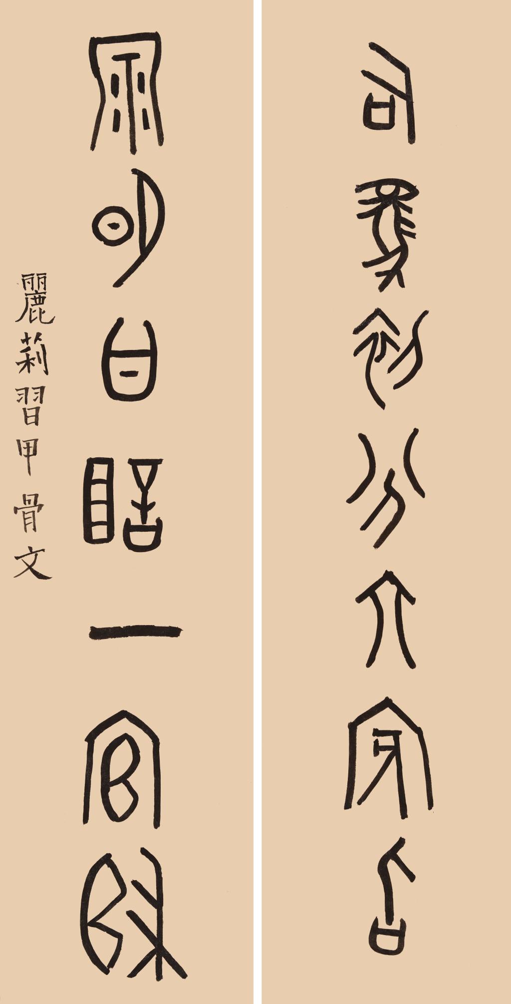 丽莉对甲骨文颇感兴趣,在了解甲骨文内涵的基础上,参考了罗振玉、潘天寿的笔法进行临摹,结课作业提交了甲骨文集联作品。她的这件作品用笔沉着圆畅,虽个别字结构生拙,但绝无初学者的轻滑浮躁之感,整体透露出生动雅正的气息。
