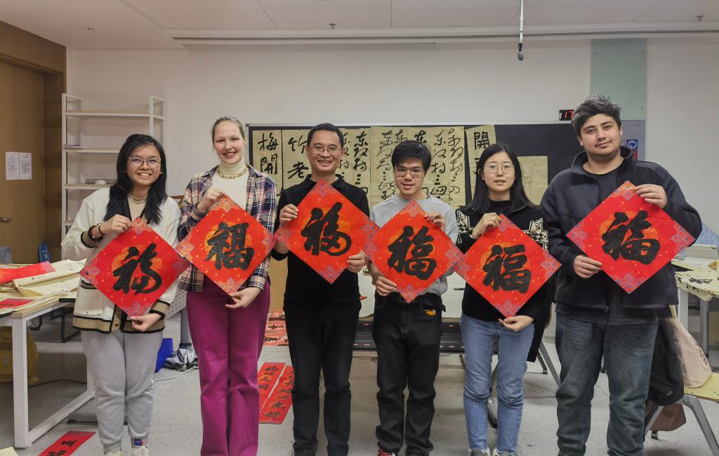 曾流金说:“我对书法很感兴趣,每次看到别人写书法我都会觉得很开心,就有很想跟着写的那种感觉。第一天上书法课我感到激动得很,因为我从来都没上过这样的书法课。王老师先给我们讲解书法的理论,然后教我们使用毛笔写字。我们几个留学生都没有准备毛笔和其他书法材料,王老师就送我们一人一支毛笔。从第一天上课直到最后一堂课王老师总是会耐心地教我们,为我们示范。开始我觉得难度很大,但我很喜欢老师给我们布置作业,因为通过写作业,我就有更多的时间去练习写字。我一般会在周末去写作业,一坐就是4个小时左右。在课堂上,王老师教了很多书体,我对王羲之《圣教序》、白蕉《兰题杂存》、还有一些魏碑特别上手。老师说我对行书的节奏把握的很好。在最后一堂课,王老师还为我们写了几张春联。经过16次的书法课学习,现在的我能按照最基本的书法技巧来写书法。虽然如此,我还是觉得自己的书法能力很低,写得还不够好。所以,我必须要加倍努力练练写字。”