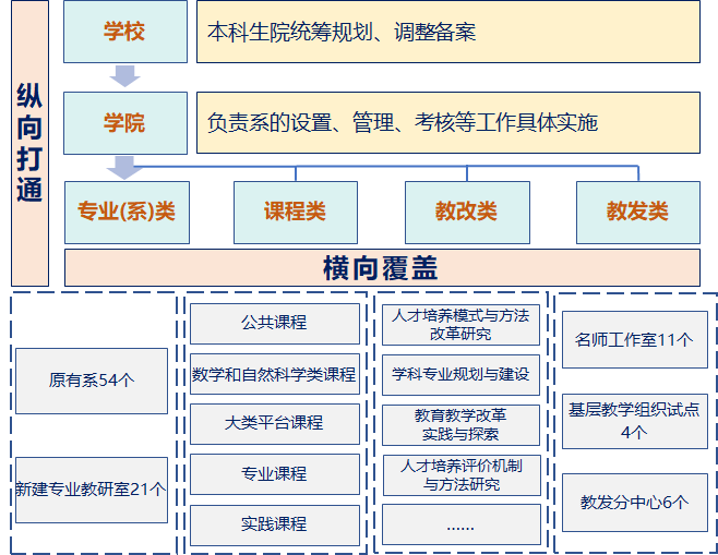 人才培养体系创新、人才培养模式优化以及人才培养能力提升需要一大批高质量基层教学组织的保障与支撑。近年来,西安交大始终把提升基层教学组织活力作为全面提升人才自主培养质量的首要任务。2016年,学校出台《西安交通大学关于基层教学组织(系)建设的指导意见》,正式明确“校-院-系”纵向三级管理机制和分级运行组织构架;2019年,学校根据培养方案结构设置教研室1079个,创新构建基层教学组织横向分类建设模式,明确分类建设任务,全面支撑和覆盖学校专业课程;2022年,学校进一步出台《西安交通大学进一步加强基层教学组织建设运行的实施意见》,明确目标定位,细化建设任务,夯实日常管理;2023年,教务处主动探索“揭榜挂帅”方式试点推进重难点领域改革,与立项教研室签订任务书,积极开展多样教研活动,带动全校上下形成“组织促交流、教研促成长”的良好氛围。