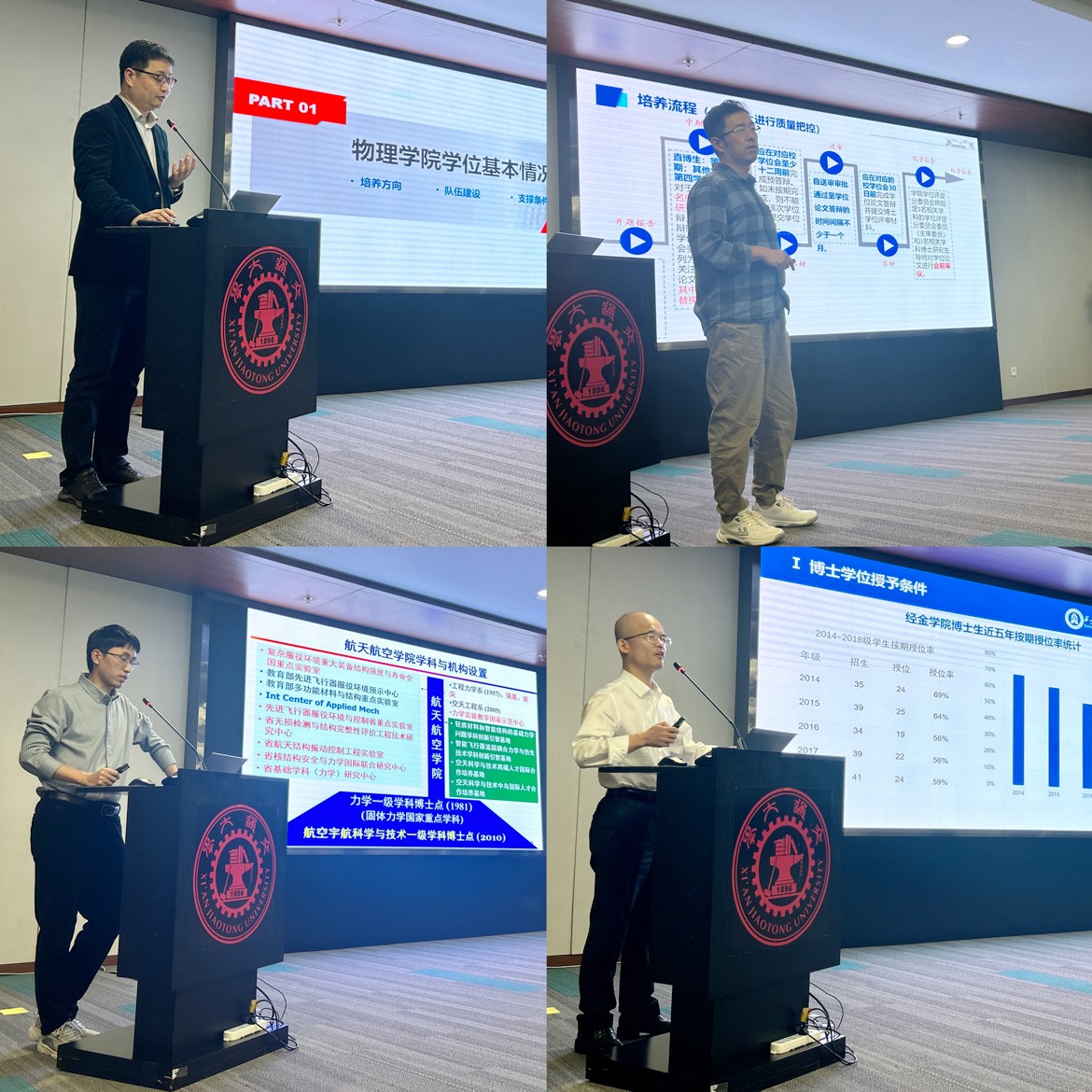 物理学院、前沿科学技术学院、航天航空学院以及经济与金融学院相继就研究生学位授予的具体条件及质量保障体系的实施策略进行了深入交流与分享。经济与金融学院副院长温军分享了学院在学位质量保障领域的创新策略,具体举措包括推行预答辩监督机制、加大论文原创性审核力度、实施统招硕士论文集中匿名评审制度以及加强导师队伍的专业培训等。前沿科学技术学院副院长邵永平则着重介绍了学院通过流程优化来强化学位质量管理的体系,同时概述了学位授予标准、质量保障举措及导师责任体系等内容。物理学院研究生专项助理孔春才副教授围绕学院的培养导向、师资建设及支撑体系三大维度,简明扼要地阐述了物理学院在培育学生家国情怀、强化基础研究创新、促进学科交叉融合及构建高端物理人才培养新范式方面的实践探索。航天航空学院院长助理张虎围绕学院“力学创新,驱动空天;空天需求,牵引力学”的发展理念,介绍了学院学位点的概况、学位申请标准及质量保障措施。