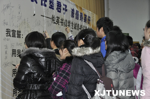 大会最后,参加会议的同学一一上台有序的在诚信考试签名墙上郑重地签下了自己的名字,表达了他们“责任塑君子,诚信铸英仔“的决心。
