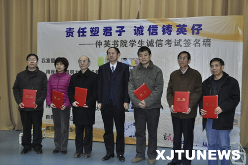 会上,仲英书院院务主任柴渭宣读了《仲英书院总导师、学业导师聘任》文件,决定聘任电气学院副院长罗先觉等六位学院负责人为各专业学业总辅导师,同时聘任各班级班主任为相应的专业导师,并一一为他们颁发导师聘书。软件学院副院长陈建明作为导师代表讲话,在谈及诚信考试时他以“诚信是做事之本,诚信更是做人之本”来告诫与会学生,并以自己的亲身经验向同学们传授了一些考试经验。随后,在仲英书院学生会主席团代表苗莹、刘祖馨、贾佳带领下全体到会学生一齐起立进行了学生诚信考试宣誓。