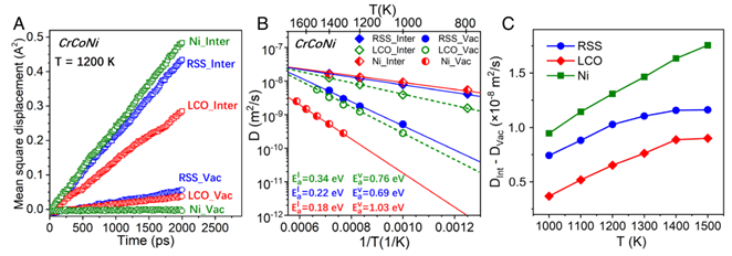 图3.点缺陷扩散行为。(A)1200 K时,间隙原子和空位的均方位移。(B)扩散系数和激活能。(C)不同辐照温度时,间隙原子扩散系数和空位扩散系数之间的差值。