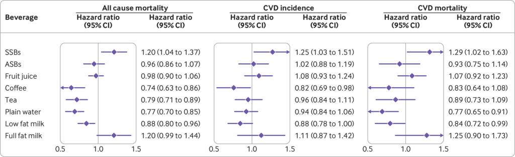 饮料改变的研究结果显示:与糖尿病诊断前后咖啡摄入量没有改变的受试者相比,糖尿病诊断后咖啡消费量增加的受试者的全因死亡率降低了18%,而糖尿病诊断后咖啡消费量减少的受试者的全因死亡率则显著上升。糖尿病诊断前后茶、饮用水和低脂牛奶摄入量的改变与全因死亡率也存在类似的关系。