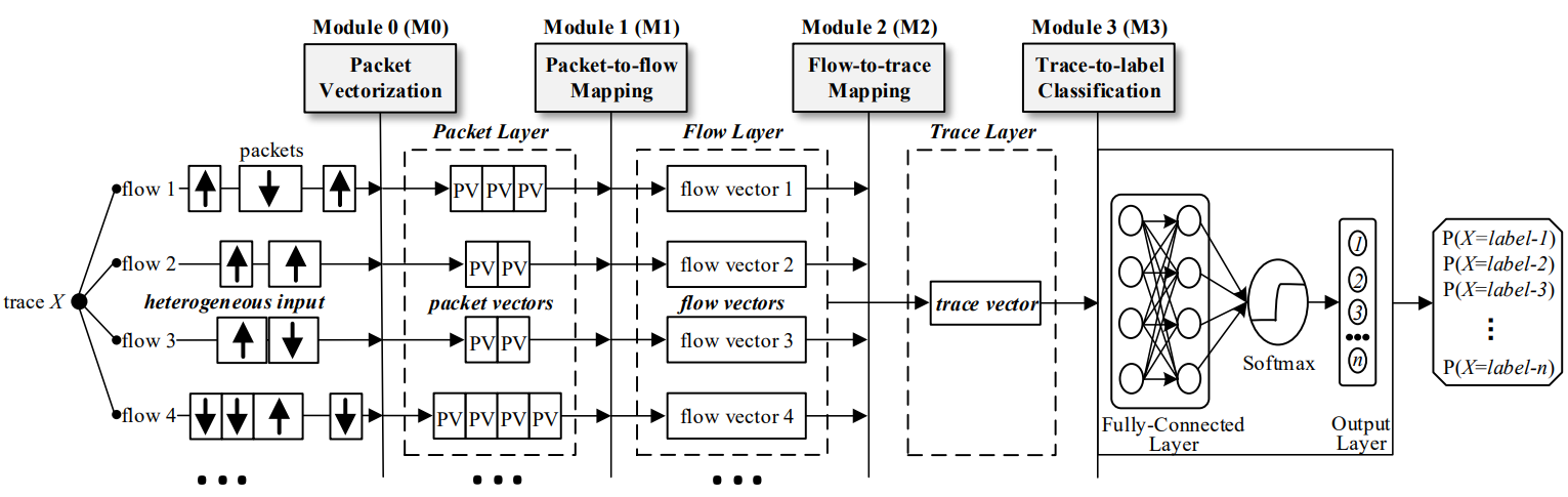 录用论文题为“面向流量指纹分析的输入不可知型层次化深度学习框架”(An Input-Agnostic Hierarchical Deep Learning Framework for Traffic Fingerprinting)。论文设计了一种输入不可知的层次化深度学习框架,仅使用一个框架即可针对异构复杂流量,实现网站指纹识别、物联网设备识别、入侵检测等多个精细化网络安全管理任务,无需针对不同任务开展人工模型及参数定制,突破了长期制约该技术规模化扩展的“人工定制成本高”瓶颈,有望应用于众多精细化网络安全管理任务。多年来,依托管晓宏院士领导的“网络化系统工程团队”,马小博教授在流量分析等领域方向的多项研究成果发表在IEEE TDSC、IEEE TIFS、IEEE/ACM TON、USENIX Security、NDSS、IEEE INFOCOM等会议期刊,相关成果在国家重要工程取得了创新性应用,社会和经济效益显著。