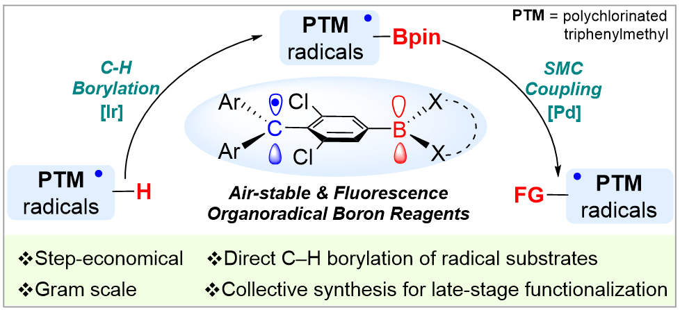 有机自由基因为具有未成对电子,呈现出独特的光电磁学性质,可应用于氧化还原电解质、发光分子、能量储存和传递等领域。同时,因为单电子占据的前线轨道(SOMO)极易发生氧化或者还原反应,所以大多数的有机自由基在室温空气中的稳定性较低。因此,与常见闭壳层有机分子相比,有机自由基的合成与直接衍生化面临着巨大的挑战。近日,饶彬课题组通过铱催化的C–H硼化反应制备了空气稳定的有机自由基硼试剂,成功应用于Suzuki-Miyaura偶联反应,合成了多种新型的三芳基甲基自由基分子。团队的研究不仅极大地拓展了三芳基甲基自由基衍生物,而且为其应用和功能化衍生奠定了坚实的基础,同时也为开壳功能分子的合成提供了新思路。相关研究成果以《空气稳定有机自由基硼试剂》(Air-Stable Organoradical Boron Reagents)为题发表在《德国应用化学》(Angewandte Chemie International Edition)上(Angew. Chem. Int. Edit. 2023, 62, e202302835)。
