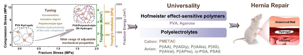 水凝胶已经是被广泛研究的柔性材料之一,但水凝胶中含水量高,往往力学性能较弱,难以满足承重组织替代品的需求。为了增加水凝胶的力学性能,研究人员提出了许多不同的策略,例如双交联网络、高缠结网络以及纳米纤维结构复合等等。成一龙团队首次发现利用聚电解质可以通过Hoffmeister效应明显地提高水凝胶的力学性能,所得到的DN水凝胶(PVA/P(iAA)水凝胶)的力学性能可以在很大范围内进行调整,抗拉强度可以从从21 kPa到1.45 MPa,伸长率从420到750%,杨氏模量从19到1020 kPa,韧性从0.04到5.43 MJ/m3,抗压强度从0.15到12.35 MPa。该研究成果以《聚电解质增韧双网络水凝胶》(Toughening Double Network Hydrogels by Polyelectrolytes)为题发表在期刊《先进材料》(Advanced Materials)上(Adv. Mater. 2023, 2301551)。
