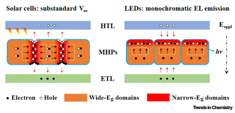 混合卤化物钙钛矿材料在太阳能电池和发光二极管(LEDs)等领域发挥着越来越重要的作用。但是,在持续光照或者电场下,混合卤化物钙钛矿材料会出现相不稳定性,初始的均匀相会逐渐转变成包含多种组分钙钛矿的混合相。这一现象会严重影响薄膜的光电特性以及器件的稳定输出,比如,钙钛矿太阳能电池的开路电压输出和LEDs中发光峰的漂移。科研工作者已经进行了大量的相关研究,尝试解释卤素离子迁移对太阳能电池和LEDs内部组分和载流子动态迁移过程的影响。然而,至今仍然没有形成统一的理论解释。