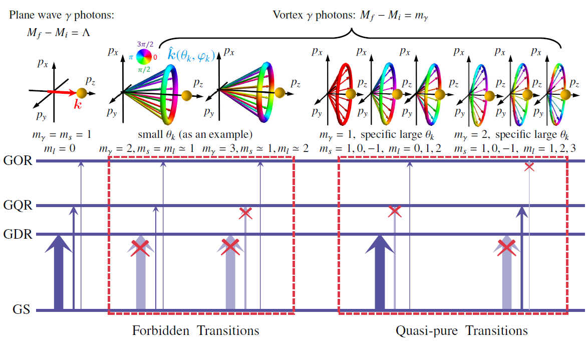 平面波或涡旋γ光子在光轴上激发偶偶核的示意图。禁戒跃迁表示具有多极性J<丨mγ丨的电磁跃迁被禁戒,其中mγ是γ光子总角动量在其传播方向上的投影。准纯跃迁表示电磁跃迁主要来自于多极性J=丨mγ丨的贡献。