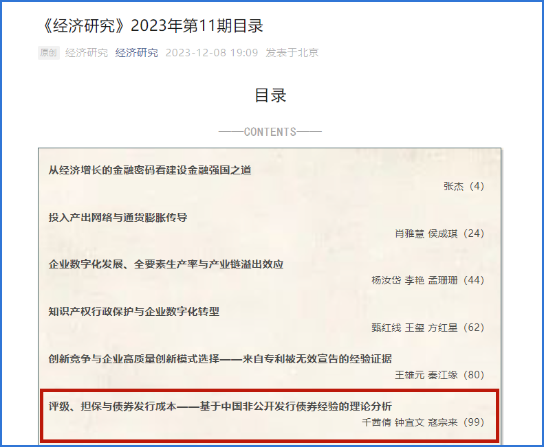 上述研究成果近期以《评级、担保与债券发行成本—基于中国非公开发行债券经验的理论分析》为题发表在我国经济学顶级期刊《经济研究》上,千茜倩是第一作者,西安交通大学经济与金融学院是第一署名单位。