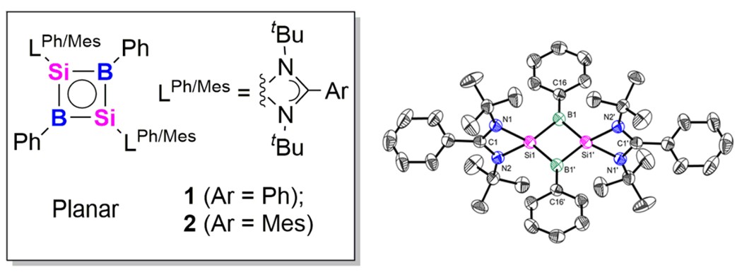 芳香性作为化学研究领域中极为重要的基本概念之一,与很多重要的化学物理性质紧密相关,因而吸引了众多实验和理论化学家的广泛关注。五元环、六元环芳香体系具有较高的稳定性且研究相对较为成熟。相反,四元环芳香体系由于存在较大的空间张力及库仑排斥力,具有高的反应活性,容易异构化为双环结构或发生开环/扩环反应而失去芳香性。目前,已知的具有2π芳香性的四元环体系种类比较少,其中,环丁二烯二正离子最为人们所熟知。主族杂原子具有独特的电子性质,利用主族杂原子构筑新型芳香体系可以有效地对分子的能级、共轭机制、电子结构、分子堆积方式等进行调控,从而赋予它们新的物理和化学性质。因此,拓展此类芳香体系,特别是利用具有独特电子结构的主族杂原子构筑新型“无机”四元环芳香体系,对于理解、发展和利用芳香性具有重要意义。然而,由于其合成及稳定策略的局限性,此类化合物的制备仍然存在非常大的挑战性。西安交大化学学院苏博超课题组一直致力于新型低价态主族元素掺杂芳香体系的合成及应用研究。近期,该团队成功合成出了一类具有2π芳香性的硅硼四元环体系,并对其光物理性质及氧化还原反应进行了详细探索。