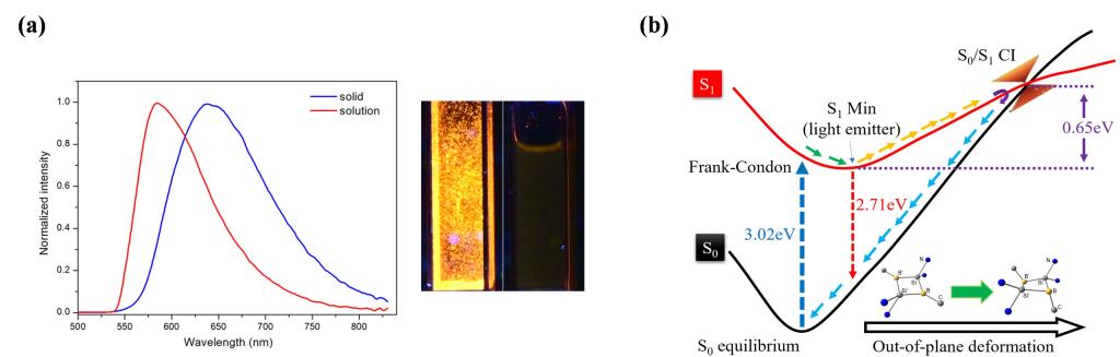 (b) 模型分子的荧光发射及非辐射衰减过程机理图