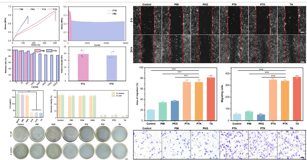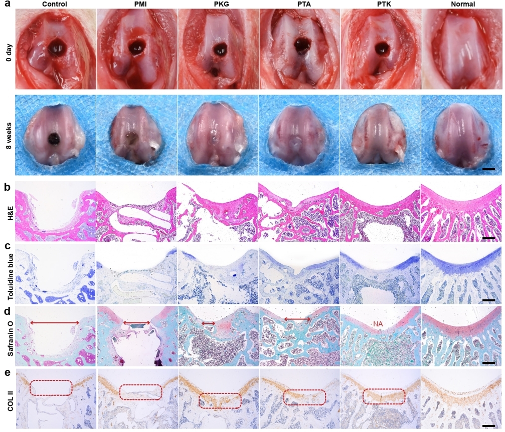 近日,西安交通大学化学学院成一龙课题组和口腔医院杨宇轩博士通过聚加成反应构建了一种分别负载生物活性因子单宁酸和软骨分化因子Kartogenin的多重氢键交联水凝胶,作为体内软骨再生的无细胞支架,实现了无需干细胞负载的软骨缺损修复再生,具有重要的临床应用价值。