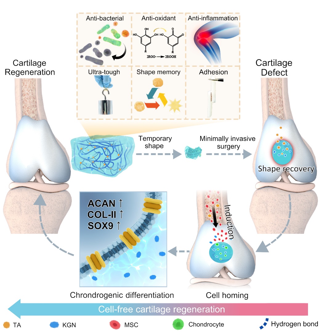 该研究制备的新型软骨修复水凝胶具有较高的抗疲劳性能和力学强度,可以承受28000次加载-卸载机械循环,并在体温下表现出快速形状记忆性能,具有应用于微创手术的潜力。同时,通过负载理化性质不同的药物分子,可以实现软骨修复过程中骨髓间充质干细胞的定向迁移和分化,从而实现体内全层软骨再生。这项工作可能为解决软骨再生问题提供一个有前景的解决方案。