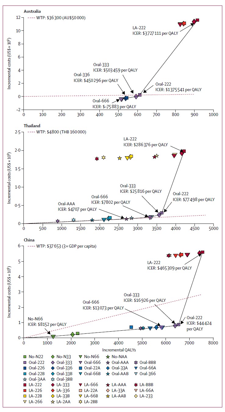 艾滋病严重危害人类健康。男男性行为者(MSM)是HIV感染的高危人群,亚太地区MSM感染HIV尤为严重。自世卫组织推荐MSM等高危人群HIV暴露前预防用药(PrEP)以来,引起全球各国普遍重视并被陆续推荐使用。PrEP的药物也在发展,除目前主导的口服药物,全球首款长效注射药物卡博特韦(CAB-LA)也于2021年获批上市,且其具有更高的依从性和保护效果。除规律性使用PrEP,针对MSM等高危人群,无论其是否适用PrEP、适用者是否使用PrEP,世卫组织均建议应定期检测HIV感染,以及时发现HIV感染尽早启动抗病毒治疗遏制HIV传播。但是,针对如何优化HIV检测频次,目前缺乏卫生经济学证据。为探讨在亚太地区MSM人群中扩大PrEP(口服药物或CAB-LA)结合HIV检测的最佳干预方案,以及CAB-LA替代口服药物的可能性,西安交大公共卫生学院团队牵头,联合澳大利亚莫纳什大学、新加坡国立大学、泰国HIV研究与创新研究中心的学者,针对亚太地区不同经济发展水平、不同HIV感染及预防控制现状的三个代表性国家(中国、澳大利亚、泰国)开展了此项研究。最近,研究成果以“中国、澳大利亚、泰国男男性行为者HIV暴露前预防用药与检测策略的优化:一项建模和成本效果分析”为题在全球公共卫生权威期刊《柳叶刀-全球健康》发表。