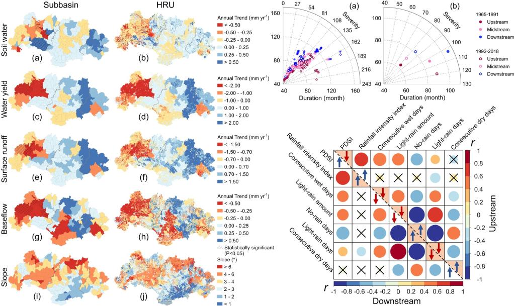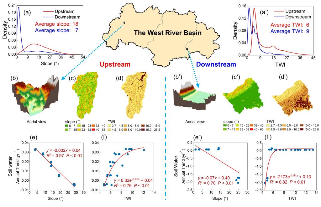 科研团队通过一系列模拟试验深入解析了降水模式变化下不同尺度(坡面、水文响应单元、子流域及区域)的水文响应机制。研究表明上下游地区的两个典型小流域的水文响应存在共性:高坡度地区变得更加干燥,而低坡度地区则变得更加湿润。由于西江流域上下游地形差异显著—上游高地较多,总体较为陡峭,而下游低地较多,总体较为平缓。因此,上游地区以变干效应为主,下游地区以变湿效应为主,从而揭示了降水增强和地形差异共同导致西江流域上下游地区两种截然相反的水文效应。