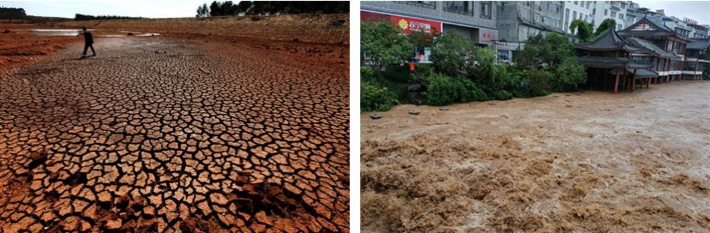 图1 2009/2010年西南地区特大干旱(左图);2020年8月强降雨致河水漫上广西蒙山街道(右图)