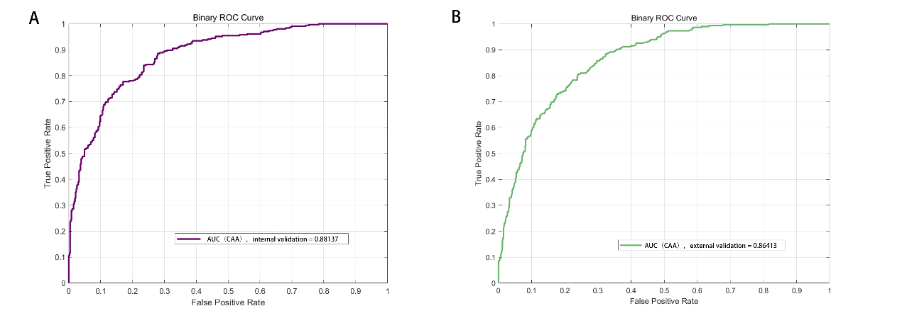 ,通过递归分割技术确定得CAA指数区分并发症发生风险的最佳截断值为5。该发现为医生提供了一个强有力的工具,以预测肝癌手术后患者的并发症风险,并据此调整患者的术后管理和监护策略,该模型预测AUC面积88.1%。并且在东方肝胆医院的1000余例外部验证数据中得到了证实,AUC曲线达到86.4%。