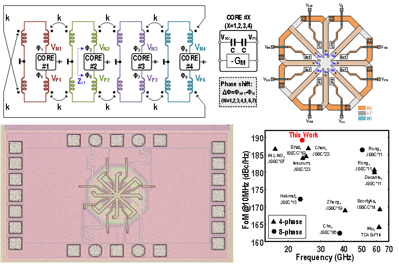 毫米波多相位时钟信号在无线通讯和高速有线通系统中有着十分重要的应用场景。针对毫米波多相位频率源芯片在相位噪声、相位精度和芯片面积效率的设计折中,论文创新性地提出“磁耦合+双注入耦合”的设计方案,并结合风车型变压器模型,有效提升毫米波多相位时钟信号的相位噪声性能、相位精度和芯片面积效率,实现同期最高的品质因数(189.2dBc/Hz FoM和200.7dBc/Hz FoMA),芯片综合性能指标处于国际领先地位,具有极高的实用价值。