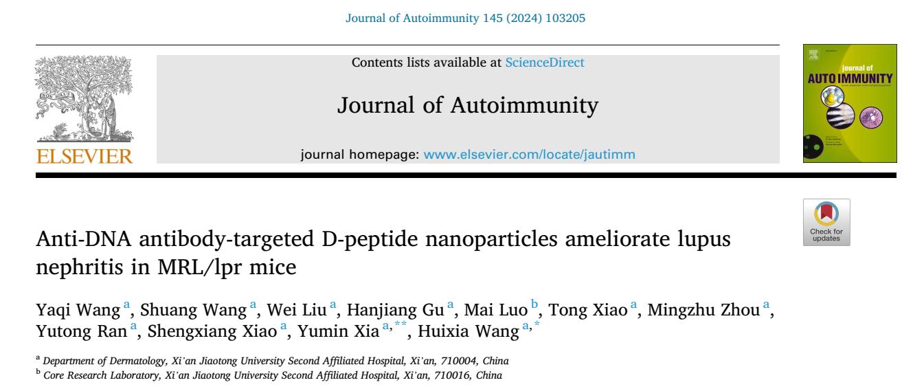 近日,西安交大二附院皮肤病院王绘霞助理研究员与夏育民教授在自身免疫学领域顶级期刊《自身免疫杂志》(Journal of Autoimmunity )发表原创性研究成果,该研究设计了一种靶向抗dsDNA抗体的D型模拟肽(D-ALW多肽)纳米微粒,该D型模拟肽能够与抗dsDNA抗体高亲和力结合,抑制抗体的致病作用,并且负载模拟肽的纳米微粒具有肾脏靶向性,成功应用于MRL/lpr狼疮小鼠模型的治疗。