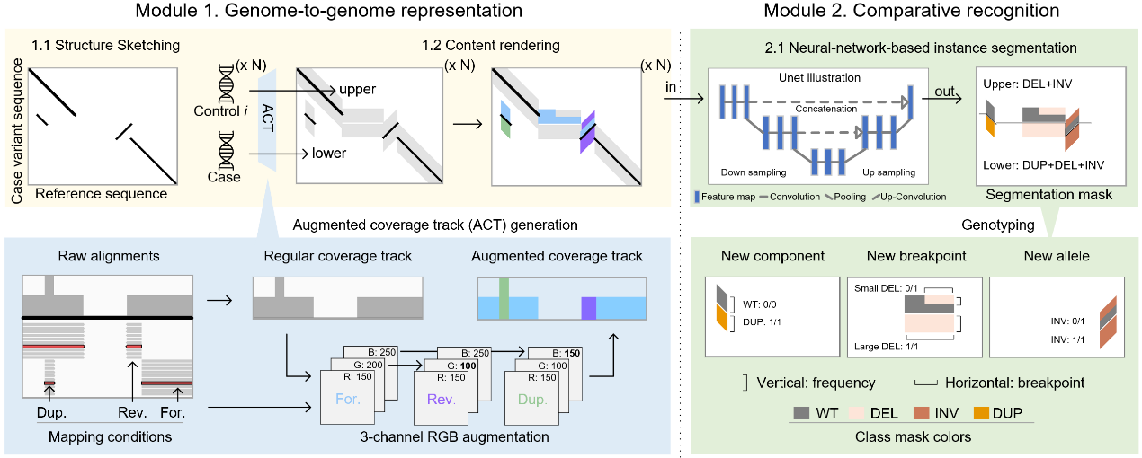 图1. 基于“序列-图像”转换策略的多样本差异比较算法SVision-pro。在信息编码模块中,多样本基因组精细比较信息从序列空间转换到图像空间;在差异识别模块中,通过深度学习分割图像空间元素,直接识别样本间结构变异精细差异。