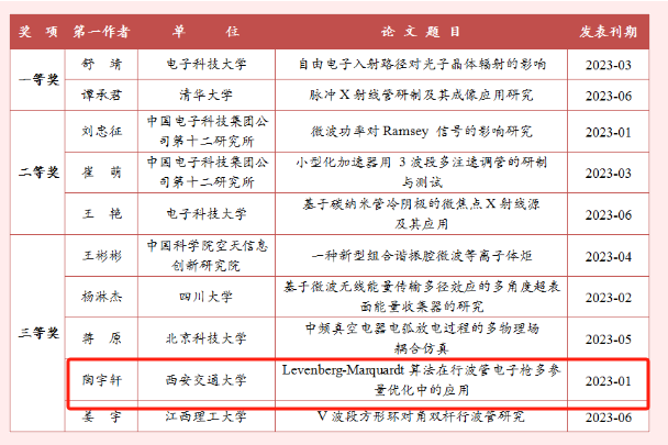 近日,西安交通大学电信学部电子学院康永锋教授团队硕士研究生陶宇轩的论文《Levenberg-Mamguardt算法在行波管电子枪多参量优化中的应用》获评优秀论文三等奖。按照“关于2023年《真空电子技术》优秀论文评选标准的通知”中优秀论文评选要求,《真空电子技术》编辑部和编委老师认真地对2023年度期刊发表的论文进行了初选和终评。依据论文的学术质量、影响力和读者反响等因素,评选出2023年度优秀论文10篇,其中一等奖2名,二等奖3名,三等奖5名。