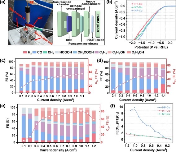 针对上述问题,先进功能材料与器件物理团队孔春才副教授等提出应力调控Cu催化剂表面*H2O覆盖度促进电催化CO2还原多碳产物。通过电还原三种不同氧化处理的CuO前驱体(双氧水氧化得到HP-CuxO、高温快速氧化得到HT-CuxO和室温缓慢氧化得到NT-CuxO),合成了三种具有不同应力的Cu基催化剂(HP-Cu、HT-Cu、NT-Cu)。通过对还原后结构精细的表征发现,HP-Cu具有显著的压缩应力(约4.8%),而HT-Cu和NT-Cu则表现出1.44%和2.88%的拉伸应力。HP-Cu在flow-cell装置中实现了1000 mA/cm²的电流密度,多碳产物的选择性超过80%;在MEA电解槽中实现了550 mA/cm²的电流密度,多碳产物的选择性超过70%,显著优于HT-Cu和NT-Cu。