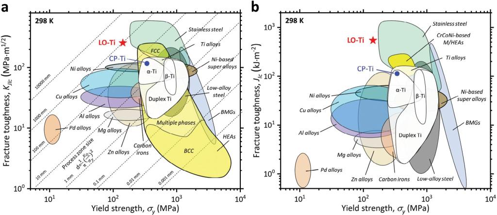 钛及钛合金作为一种轻质、高强、耐腐蚀的金属材料,被广泛应用于航空航天、海洋工程和生物医用领域。近年来,随着“损伤容限”设计理念在工业界的不断推进,对钛的断裂韧性的要求也日益提高。然而,经过数十年的合金化设计和加工工艺改进,钛及钛合金的断裂韧性始终低于130 MPa∙m1/2,远低于一些奥氏体不锈钢和面心立方结构的中/高熵合金(断裂韧性超过200 MPa∙m1/2)。这种断裂韧性的不足限制了钛及钛合金在一些关键负载条件下的应用。人们不禁要问,钛及钛合金的断裂韧性仅能达到130 MPa∙m1/2吗?