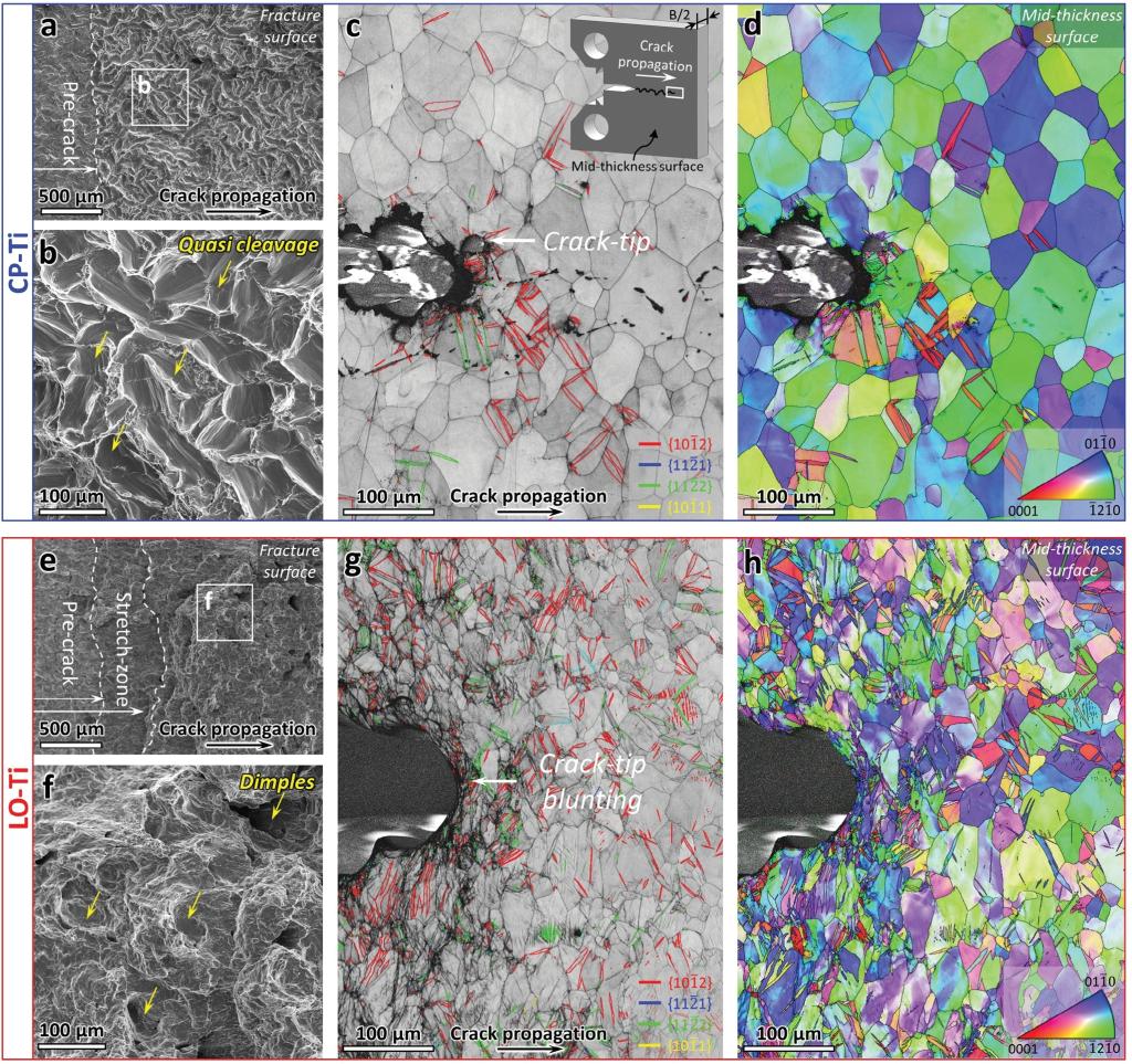 裂纹尖端的晶粒尺寸被显著细化,而商业纯钛的裂纹尖端仅有少量的变形孪晶