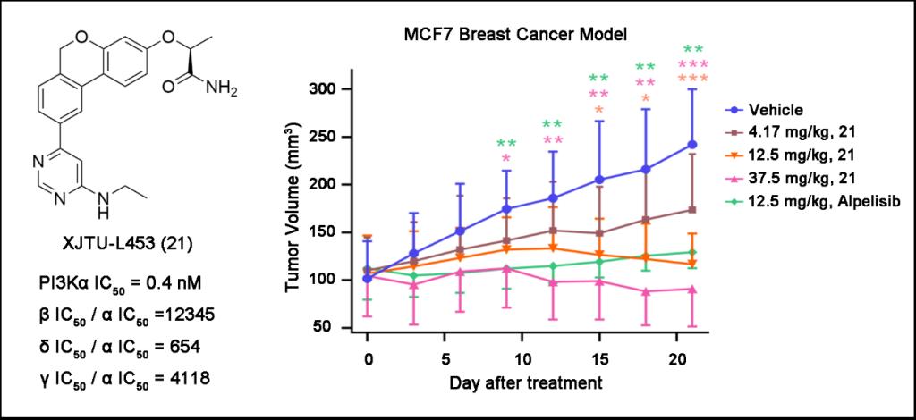 Alpelisib是全球首个,也是唯一上市的PI3Kα选择性抑制剂,而我国尚无上市的自主知识产权的PI3Kα选择性抑制剂。PI3Kα选择性抑制剂的发现极富挑战性,首先I类PI3K四个亚型(PI3Kα、β、δ、γ)的序列同源性和结构保守性高,高度选择性抑制PI3Kα难于实现。其次,PI3Kα作为热门靶点,欧美制药公司已报道多种骨架结构的PI3Kα抑制剂,发现创新骨架并获得知识产权更是困难重重。西安交通大学药学院李义平教授团队和佛罗里达大学药学院李成龙教授长期开展国际合作,致力于创新药物的发现。针对PI3Kα选择性抑制剂的发现,历经十年,在设计合成的600多个6H-苯并[c]苯并吡喃母核化合物中,发现了全新结构、具有完全自主知识产权的PI3Kα选择性抑制剂,编号为XJTU-L453。