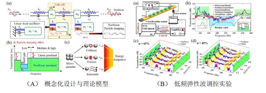 针对上述问题,西安交通大学机械工程学院吴成军教授、马富银教授团队基于将微尺度化颗粒阻尼与新型吸隔振超结构相结合的原创思想,提出了一种具有非线性阻尼的多尺度弹性超结构(图1A),利用其独特的传输特性和“借力打力”效应(利用激励来抑制振动)实现了优异的宽低频弹性波控制效果(图1B),为未来低频弹性波高效控制技术发展提供了新的方向。