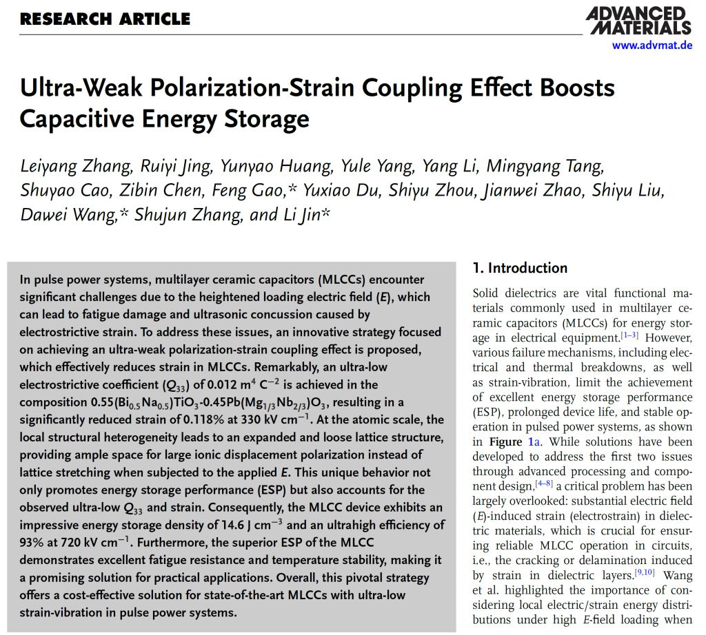针对以上难题,近日,西安交通大学电信学部靳立教授团队、联合合作团队创新地提出一种先进的“Weak Polarization-Strain Coupling”策略,用于降低弛豫铁电(RFE)基电介质材料中的电致应变并实现高储能性能、稳定性和循环寿命,以“Ultra-Weak Polarization-Strain Coupling Effect Boosts Capacitive Energy Storage”为题,发表于Advanced Materials期刊。
