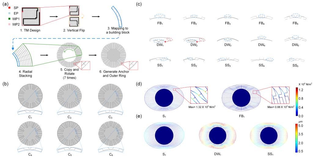 图(c)创新性拓扑设计范式,其中FBi为弹性梁结构、DWi为双翼式结构、SSi为步进阶梯式结构;