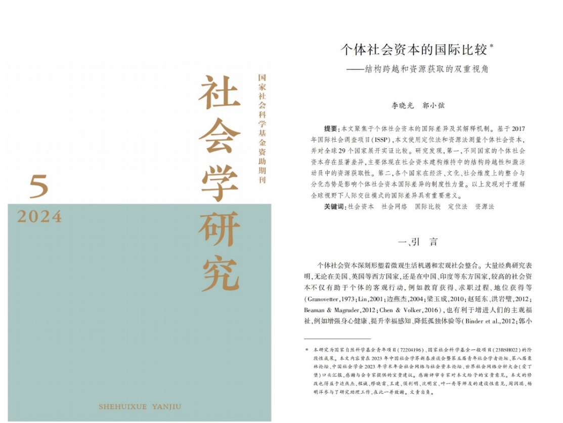 近期,人文学院社会学系青年教师李晓光与郭小弦合作完成的论文《个体社会资本的国际比较——结构跨越和资源获取的双重视角》发表于社会学领域权威期刊《社会学研究》2024年第5期。