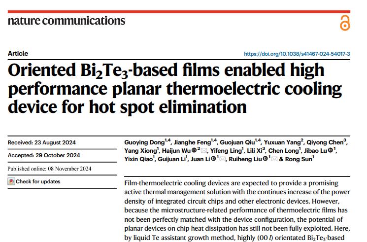 近日,材料学院材料相变行为研究组武海军教授与中国科学院深圳先进技术研究院团队合作,在权威刊物《Nature Communications》(《自然通讯》)在线发表研究论文“Oriented Bi2Te3-based films enabled high performance planar thermoelectric cooling device for hot spot elimination”(“高取向碲化铋薄膜赋能面内热电器件用于芯片热点散热”)。西安交通大学材料学院武海军教授为第一通讯作者。材料学院在读博士生杨宇轩为论文共同作者。本项研究工作得到了西安交通大学分析测试中心在微结构表征方面的支持。