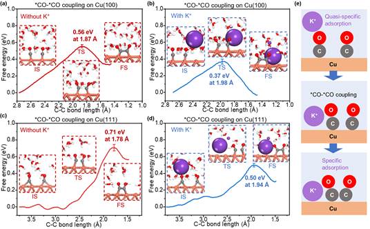 D)在存在K+离子的情况下,Cu(111)表面上*CO-*CO偶联的广义自由能。这里联合变量(CV)被定义为两个偶联C原子之间的距离。
