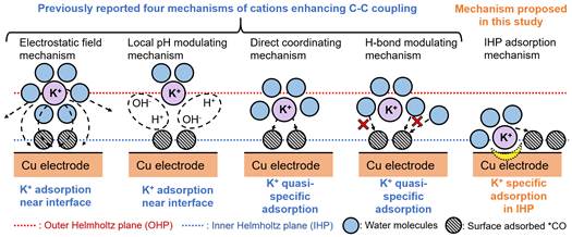 电催化CO2还原过程中碱金属阳离子促使CO偶联的机理示意图。包括四种以往工作中提出的机理和本文中提出的机理。