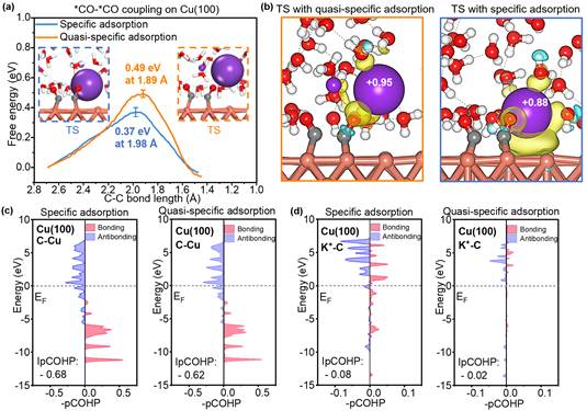 D)在特异性/准特异性吸附K+的情况下,过渡态中*C原子与K+离子之间的pCOHP结果。