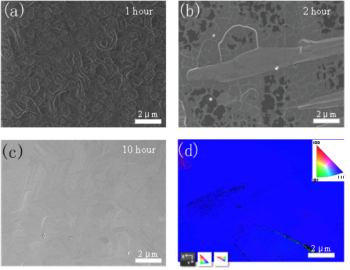 图1显示金刚石(111)单晶薄膜在Ir(111)/蓝宝石表面随外延生长时间的表面形貌,图1(a)中可以看出,外延生长1小时后,形成了密集的六方结构单晶金刚石(111)连续薄膜。随着外延生长的时间增加,六方结构的表面逐渐闭合成连续平整的薄膜,如图1(b)所示。外延生长10小时后,形成了平坦的单晶金刚石(111)表面,如图1(c)。图1(d)为金刚石(111)表面的EBSD测试图谱,结果显示金刚石(111)面的晶向具有良好的均匀性。