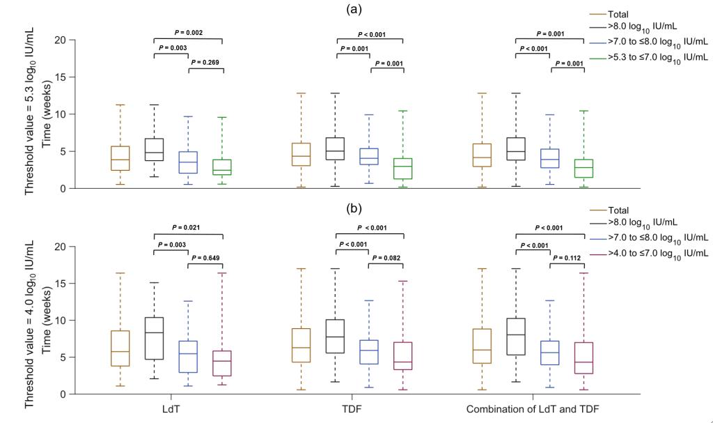 图2不同初始病毒载量水平下服用抗病毒药物替比夫定(LdT)和 替诺福韦(TDF)后病毒载量下降至两种阈值所需的孕周数