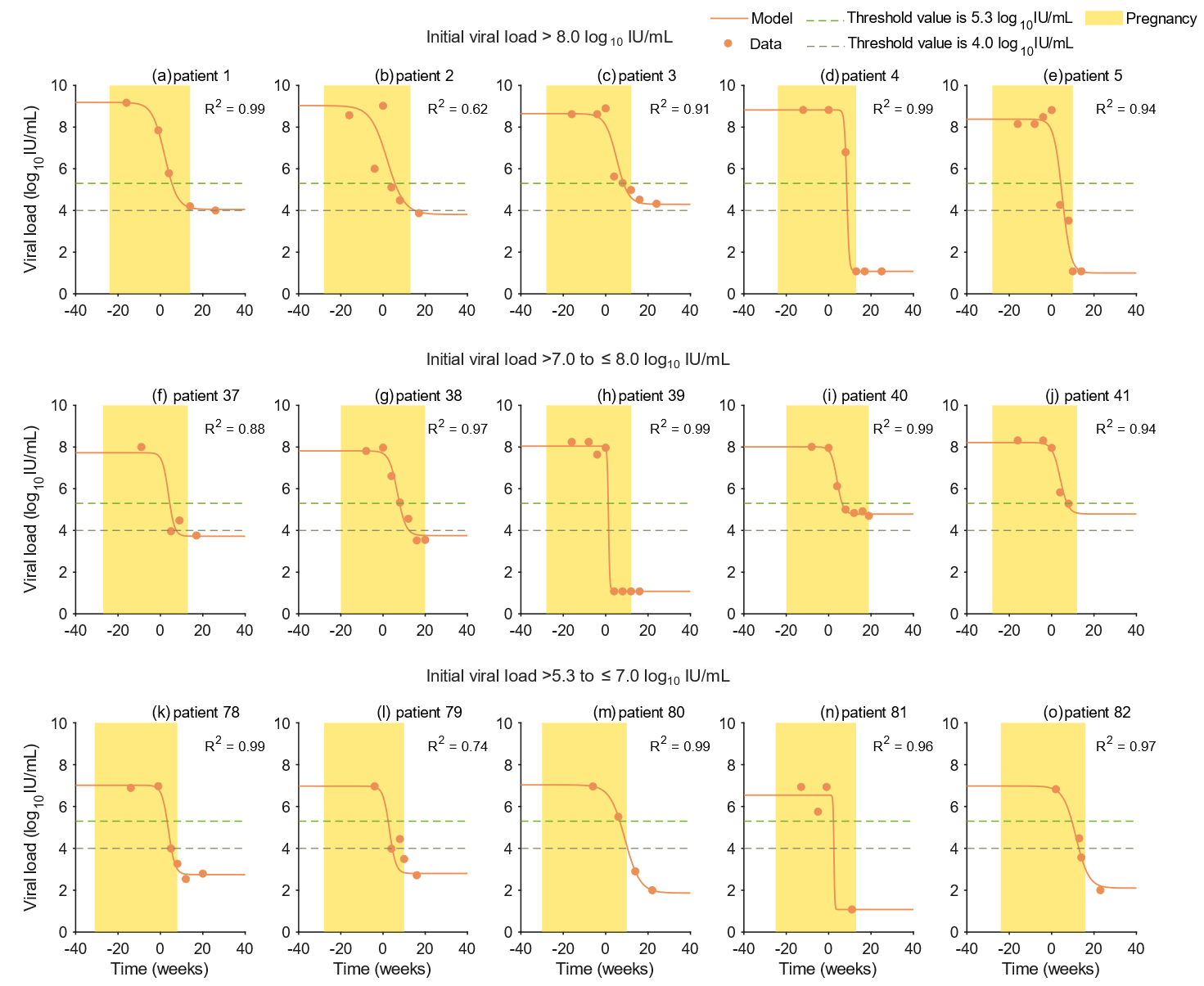 该研究整合了2010-2020年期间在交大一附院感染科就诊的4832名慢性乙肝孕妇真实世界临床数据,经过数据清洗和纳排标准,筛选出328名接受替比夫定(LdT)或替诺福韦(TDF)治疗的慢性乙肝孕妇数据进行建模。通过引入生物数学领域病毒动力学的建模思想,提出了一个简易的数学模型来刻画每个孕妇在孕期接受抗病毒治疗后体内HBV DNA 水平的动态变化趋势,并给出直观的显式表达式来计算将HBV DNA水平降至母婴传播风险可忽略不计(0.04%)的阈值(5.3 log10 IU/mL)水平以下所需的时间。进一步通过对群体数据进行统计分析,计算出孕期开始接受抗病毒治疗的最晚孕周。结果显示(图1-图2),328名慢性乙肝孕妇在接受抗病毒治疗后体内病毒载量降至阈值(5.3 log10 IU/mL)所需要的时间为4.2(0.2-12.8)周,应在不晚于35.1(25.2-41.4)孕周开始接受治疗。特别地,对于HBV DNA8 log10 IU/mL的孕妇,应在不晚于33.9(25.2-39.5)孕周开始接受治疗,为了最大限度地提高临床安全性,建议最晚应该在孕25.2周前开始抗病毒治疗。如果将阈值降至4.0log10 IU/mL(母婴传播风险为0.0%),则开始治疗的时间不应晚于33.2(21.7-39.3)孕周,尤其是HBV DNA8 log10 IU/mL的孕妇,建议在21.7孕周前开始抗病毒治疗,以进一步降低母婴传播风险。通过估算,将开始抗病毒治疗时间提前使得生产时孕妇HBV DNA水平从5.3 log10 IU/mL降至4.0 log10 IU/mL以下,每年可在中国避免4780(3089-5780)名新生儿感染乙肝。