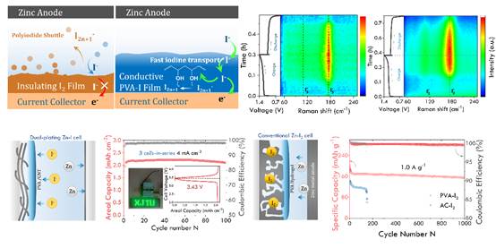 针对这一问题,西安交通大学化学学院丁书江团队开发了一种可实现碘离子快速传输的聚乙烯醇水凝胶层,显著提高了锌碘电池的比容量。此外,聚乙烯醇链与聚碘阴离子之间的强相互作用阻止了穿梭效应,使得容量和循环寿命均显著提高,组装的聚乙烯醇-碘软包双镀型电池和传统型电池都表现出优异的性能。通过原位拉曼光谱、原位光学显微摄影和DFT计算分析了聚碘化物在聚乙烯醇水凝胶中独特的快速传输行为,发现碘在聚乙烯醇链上的强结合力和较低的解离能是降低穿梭效应和实现聚碘化物快速传输的主要原因。本研究为多碘离子的快速运输提供了一个全新的思路,对于锌碘电池的实际应用提供了有益参考。