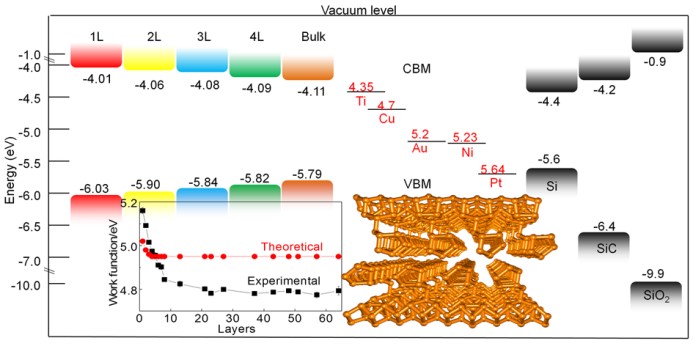 紫磷烯作为单质半导体二维材料,具有广泛的光、电、催化及医学领域的应用前景。二维材料的功函数和能带结构为其后续应用提供设计依据。由于宏观尺寸的紫磷单晶于2019年刚刚由本研究团队在实验室成功合成,紫磷稀也刚刚被剥离出来,所以紫磷稀的所有性能研究尚处于空白。