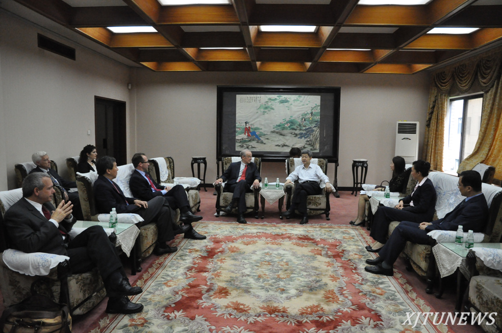 5月23日,美国内布拉斯加林肯大学校长Harvey Perlman率团访问西安交大。校党委书记张迈曾、校长王树国会见客人,并举行会谈。卢天健副校长、校长助理荣命哲、国际处梁莉处长、国际教育学院宋玉霞常务副院长、孔子学院黄平安副院长、美国交流中心副主任Ian Newman参加会见。