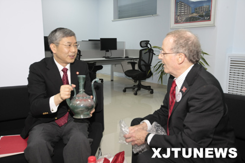 成立仪式前,郑南宁校长亲切会见Harvey Perlman校长一行,双方愉快交谈,并互赠礼物。宋晓平副校长、宫辉副书记一同参加会见。
